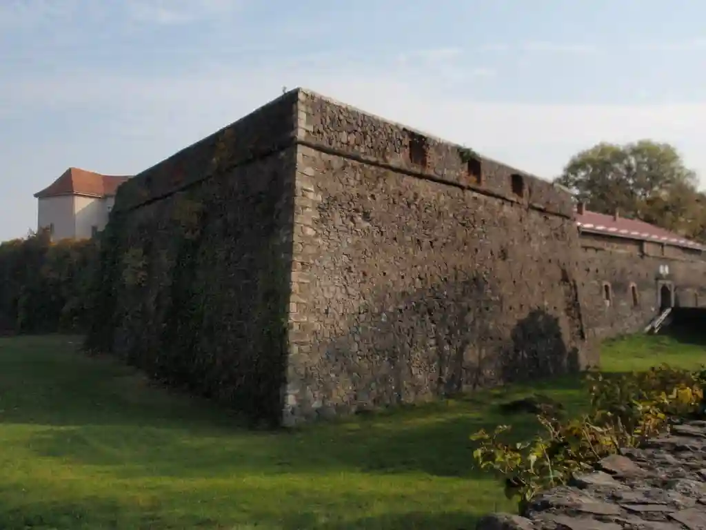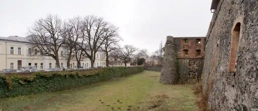 В Ужгородском замке по проекту итальянских инженеров была проведена реконструкция — были выстроены новые стены, на углах сооружены ромбовидные бастионы, высота которых достигает 10-15 м. В плане замок был неправильным четырёхугольником — это обусловлено рельефом Замковой горы. С трех сторон замок окружает ров глубиной в 8−10 метров, через который был перекинут подъёмный мост. Толщина внешней крепостной стены 2,5-3м .
